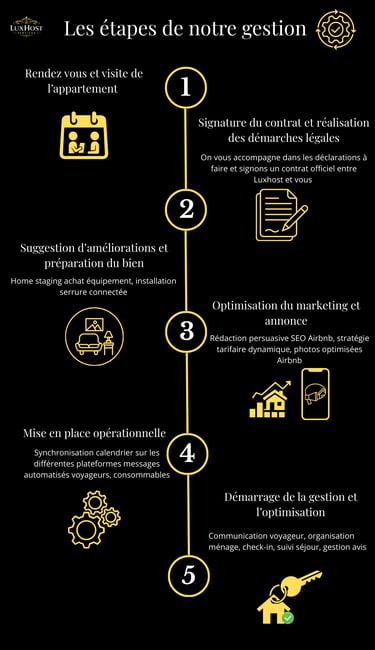 Nous assurons la gestion complète ou partielle de votre bien incluant les annonces, réservations, check-in/out, ménage, linge, maintenance, communication voyageurs et optimisation de l'expérience client premium